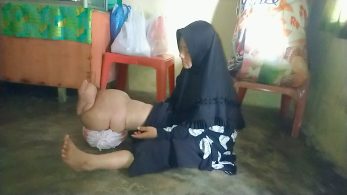 Anaknya, Alika (8) mengidap tuna daksa (tidak bisa bicara dan berjalan) membuat ibu Fatimah semakin sedih.