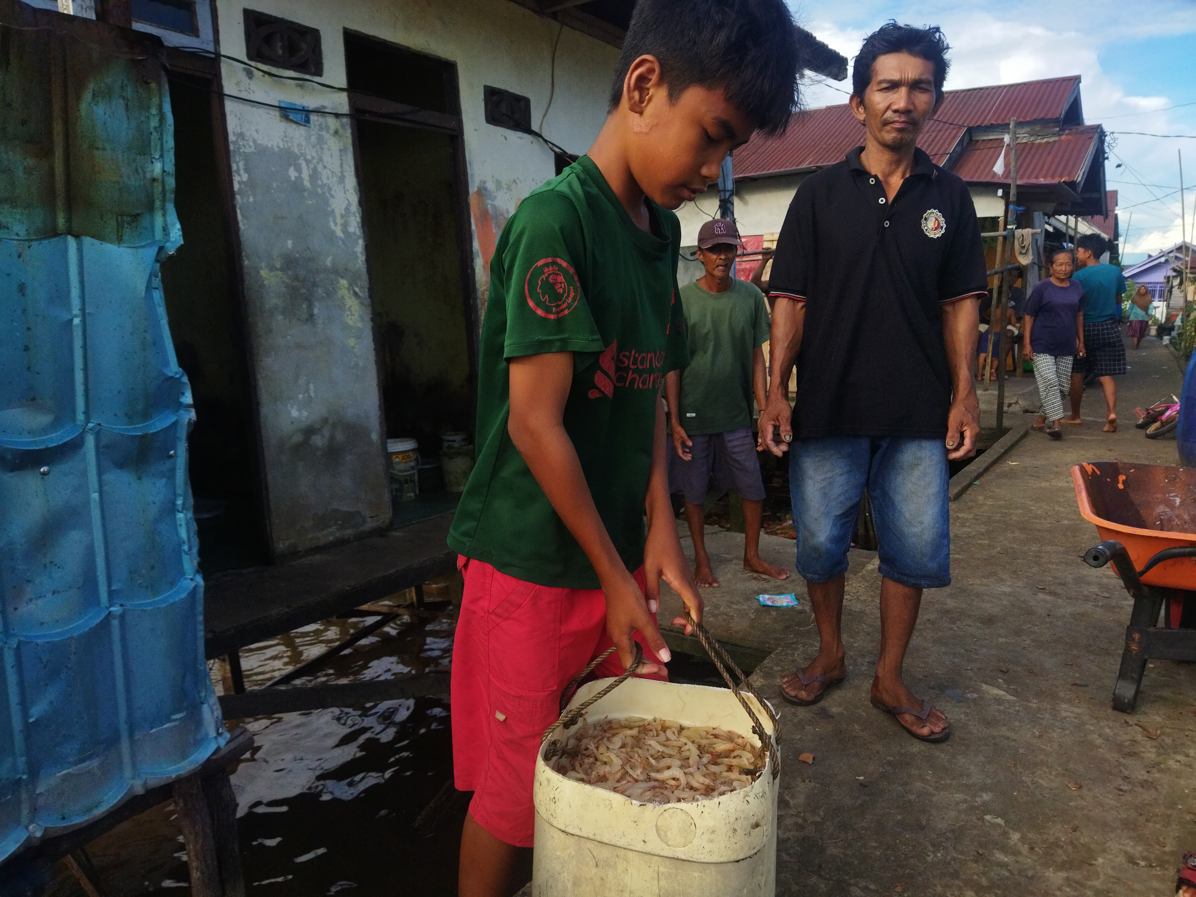 Sepulang sekolah, Rizky ikut membantu abangnya bekerja membongkar ikan.