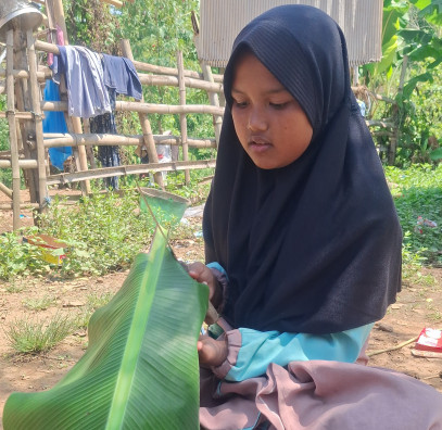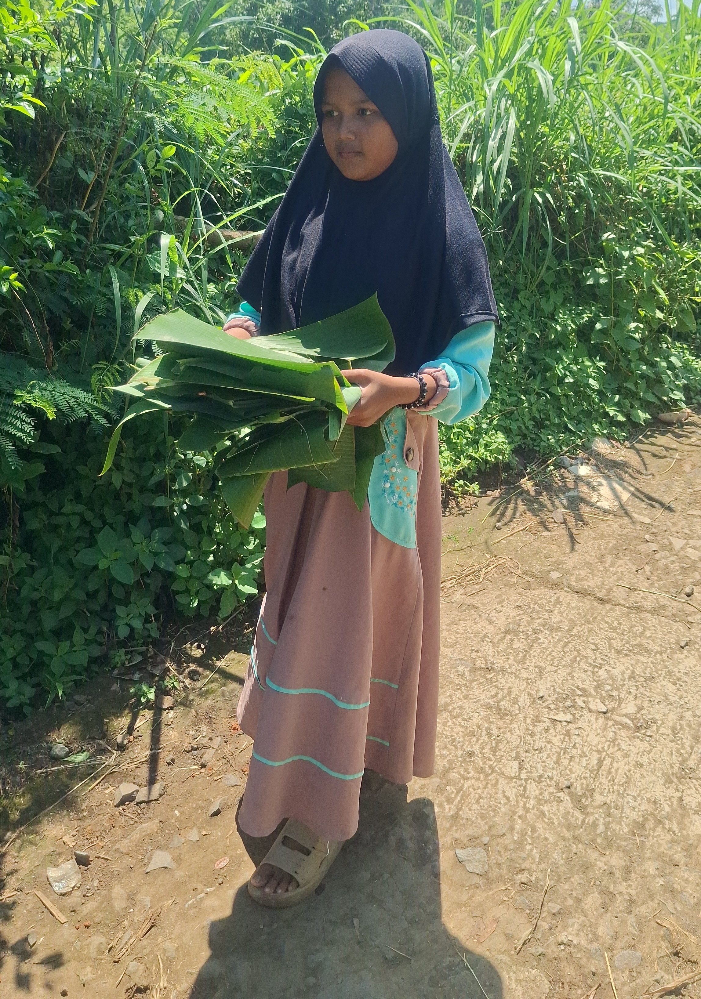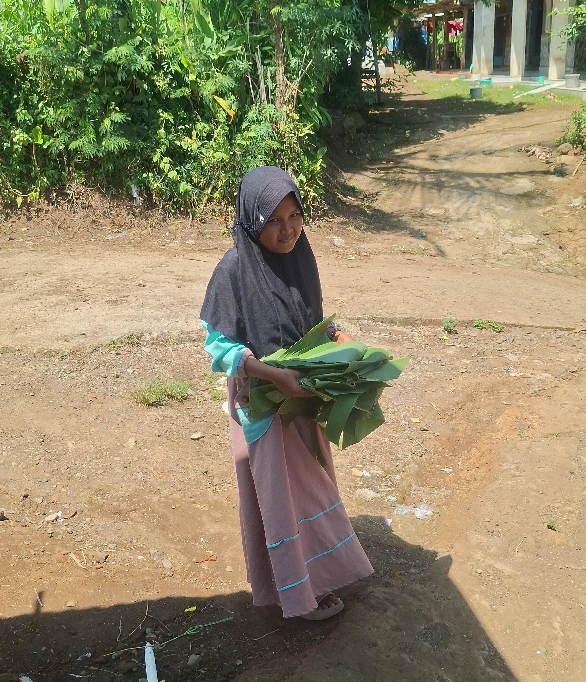 Setiap pagi lubna sudah menyiapkan irisan daun pisang untuk dijualnya keliling kampung. Satu ikat ia jual seharga 3ribu. Kadang ia membawa satu ikat, kadang lima tergantung ketersediaan. Dari semua usaha itu, ia hanya mendapat upah 5ribu per hari dari pemilik daun pisang.